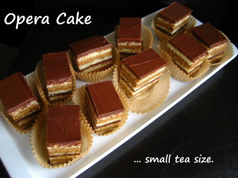 In any case, this particular cake has been on my mind for a VERY long time! It's a cake we often order when travelling... because when we travel, we don't set too many restrictions on the foods we eat. We really enjoy trying out as many new or different foods as possible... We'll share most times, this way we don't overeat and get sick:). Actually, it's a good thing we don't travel often:). But if we see an Opera cake offered in a bakery, or if it's on the menu, we most likely will order a piece:).